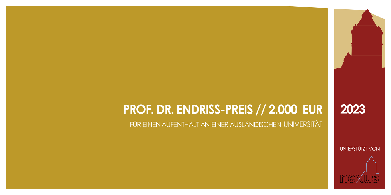 Du möchtest ins Ausland aber finanziell könntest du Unterstützung gebrauchen? Dann freuen wir uns umso mehr, auch in diesem Jahr wieder den Professor Dr. Endriss-Preis ausschreiben zu können. Bewirb dich bis zum 31. Juli 2022 für den Prof. Dr. Endriss-Preis 2022, um dein Auslandssemester im Wintersemester 2022/23 oder Sommersemester 2022 zu ermöglichen! Nähere Infos findest du unten in der Ausschreibung. Viel Erfolg!